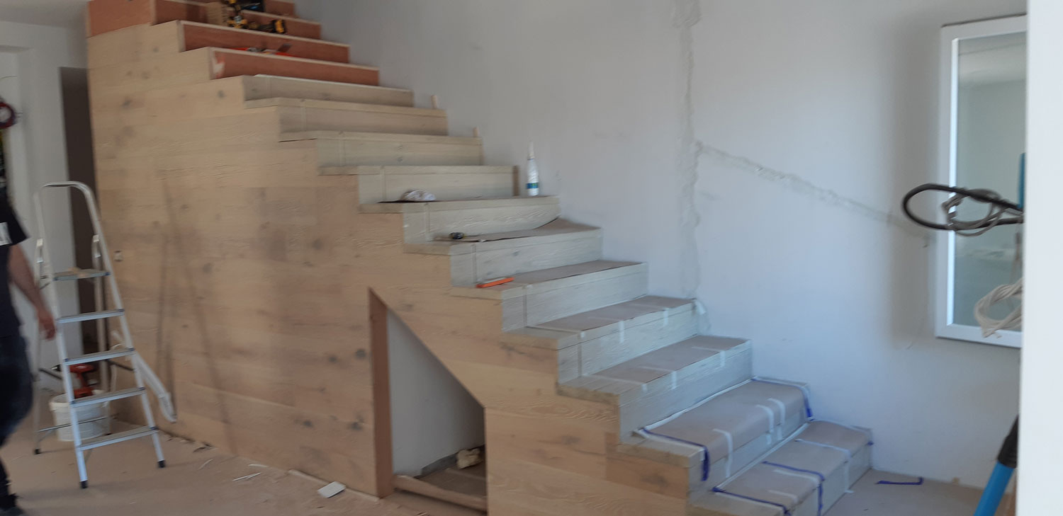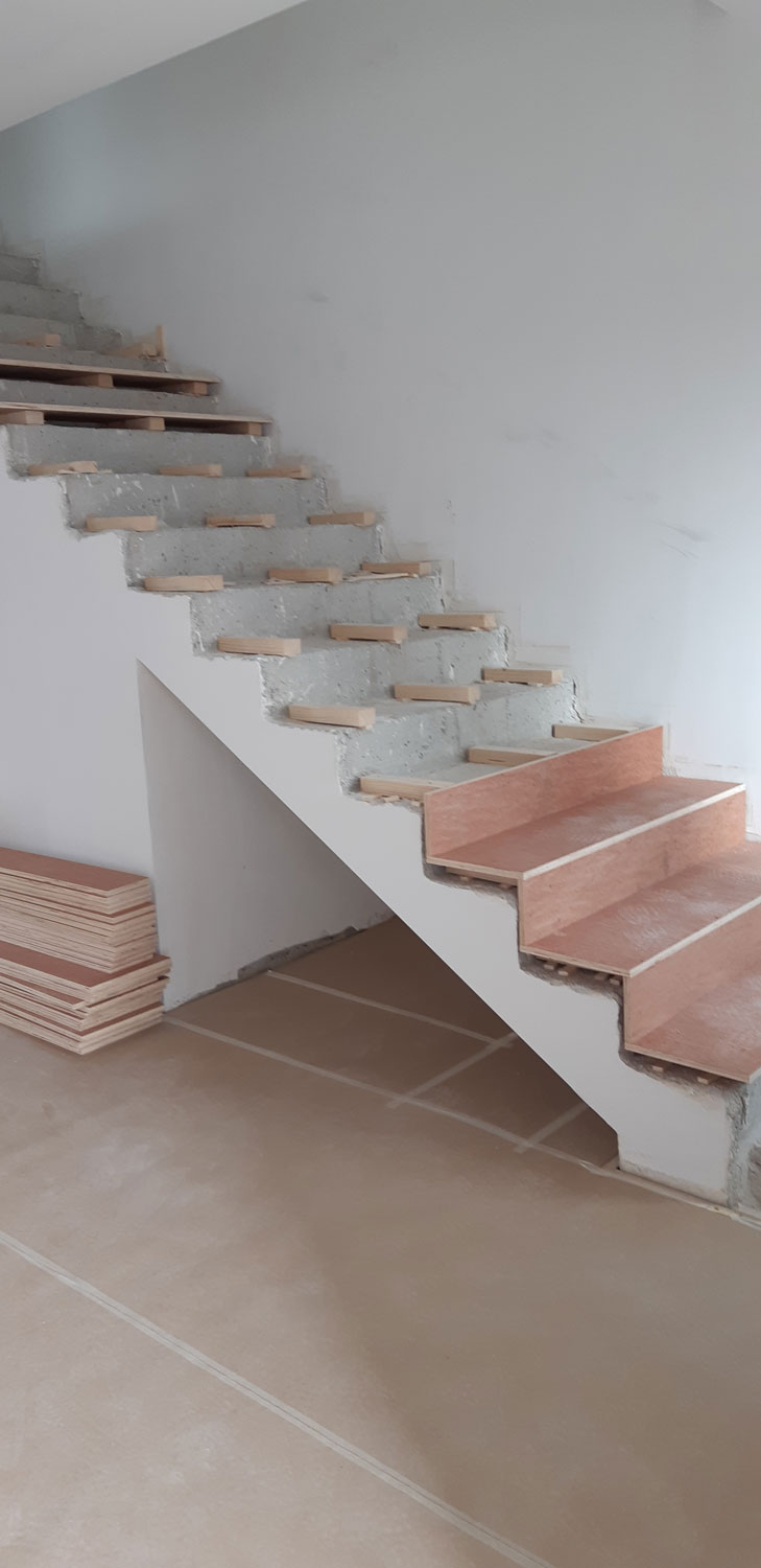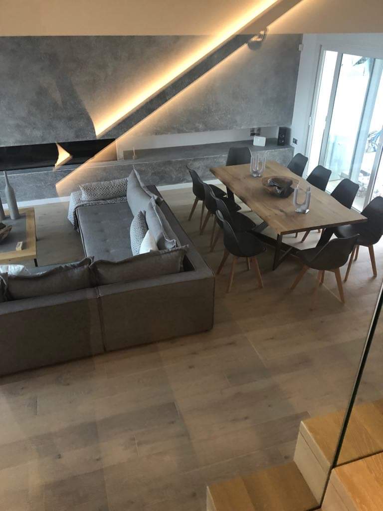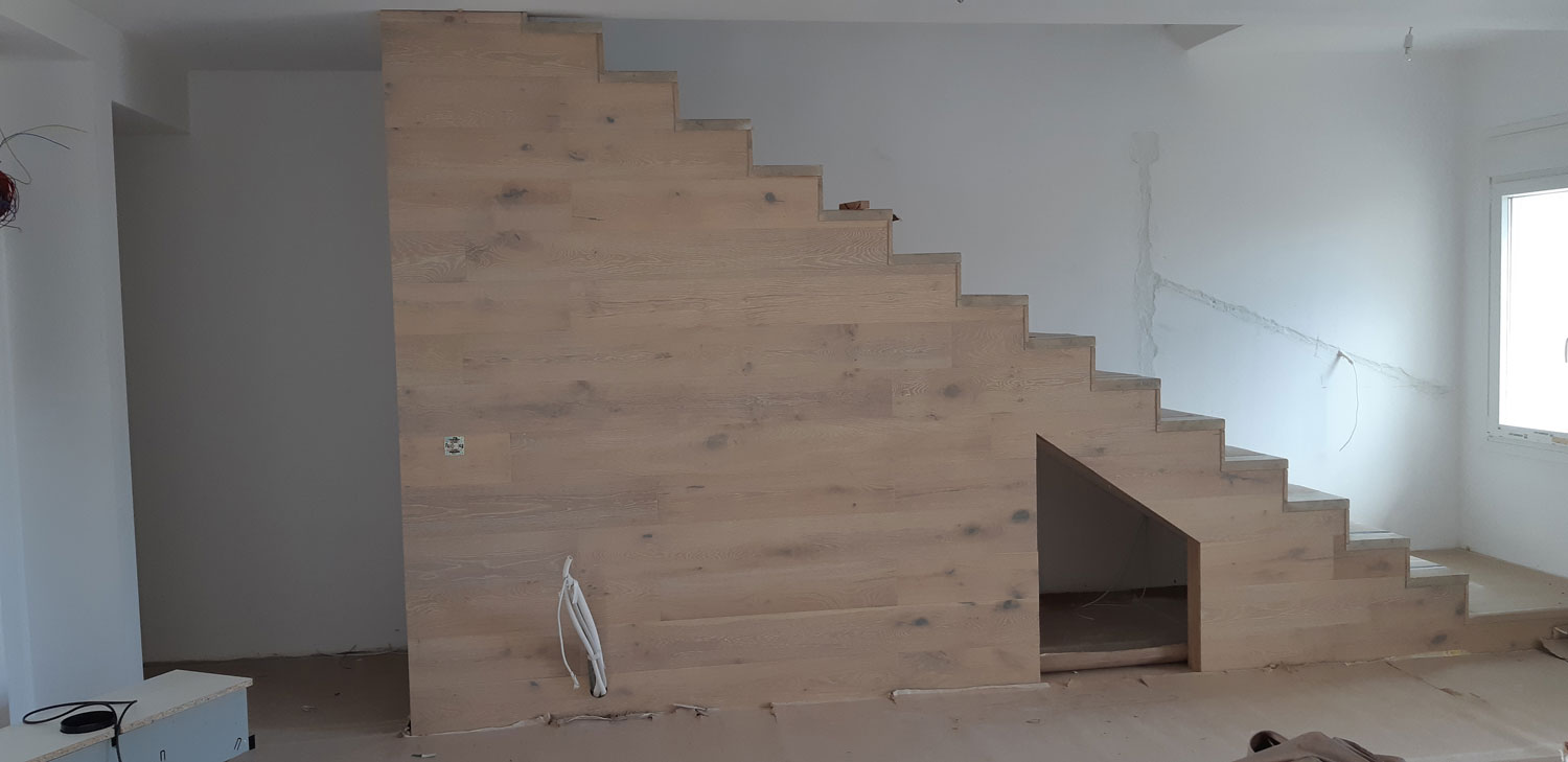 Στην κατοικία ενυπάρχει έντονο το στοιχείο του φυσικού ξύλου, ένα υλικό που αγαπούν πολύ ο Στέλιος κι η Αγγελική (ιδιοκτήτες). Επιλέχθηκε η χρήση του “iroko” εξωτερικά, καθώς έχει μια απόχρωση που εναρμονίζεται με τον περιβάλλοντα χώρο της κατοικίας. Εσωτερικά έχει επιλεγεί η παλαιωμένη δρυς για τα δάπεδα και τη σκάλα.