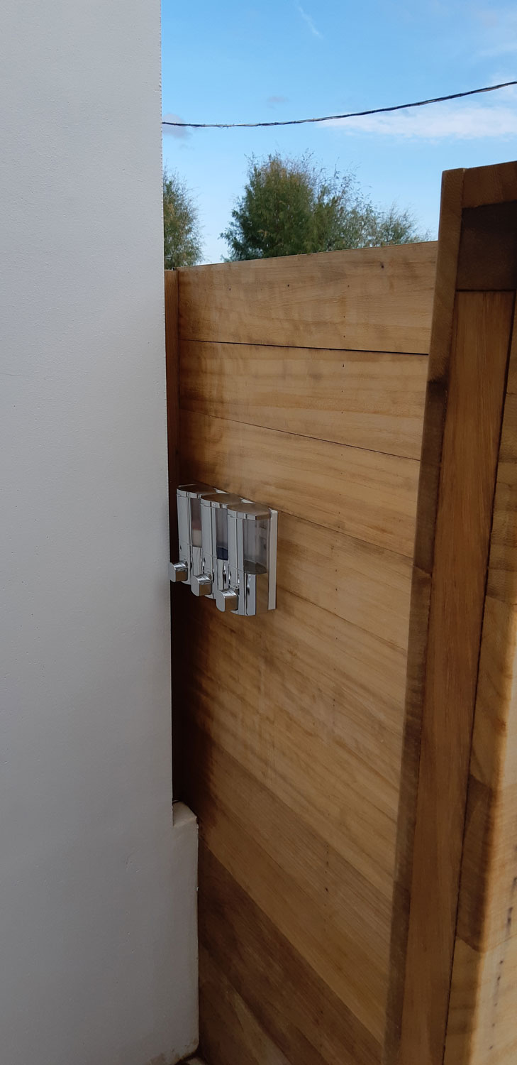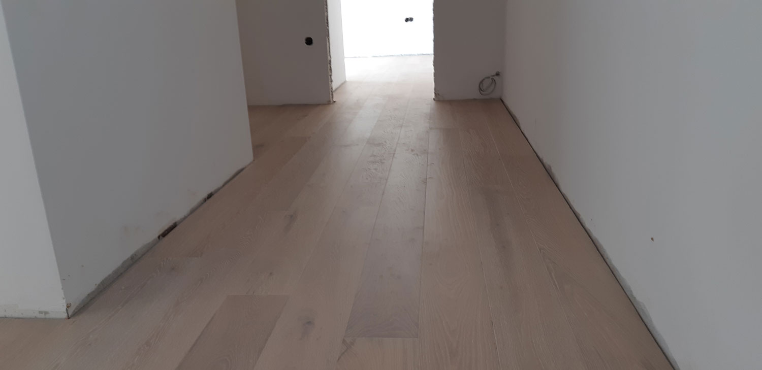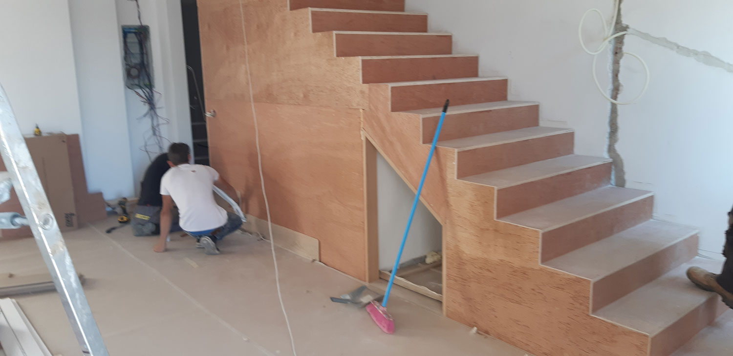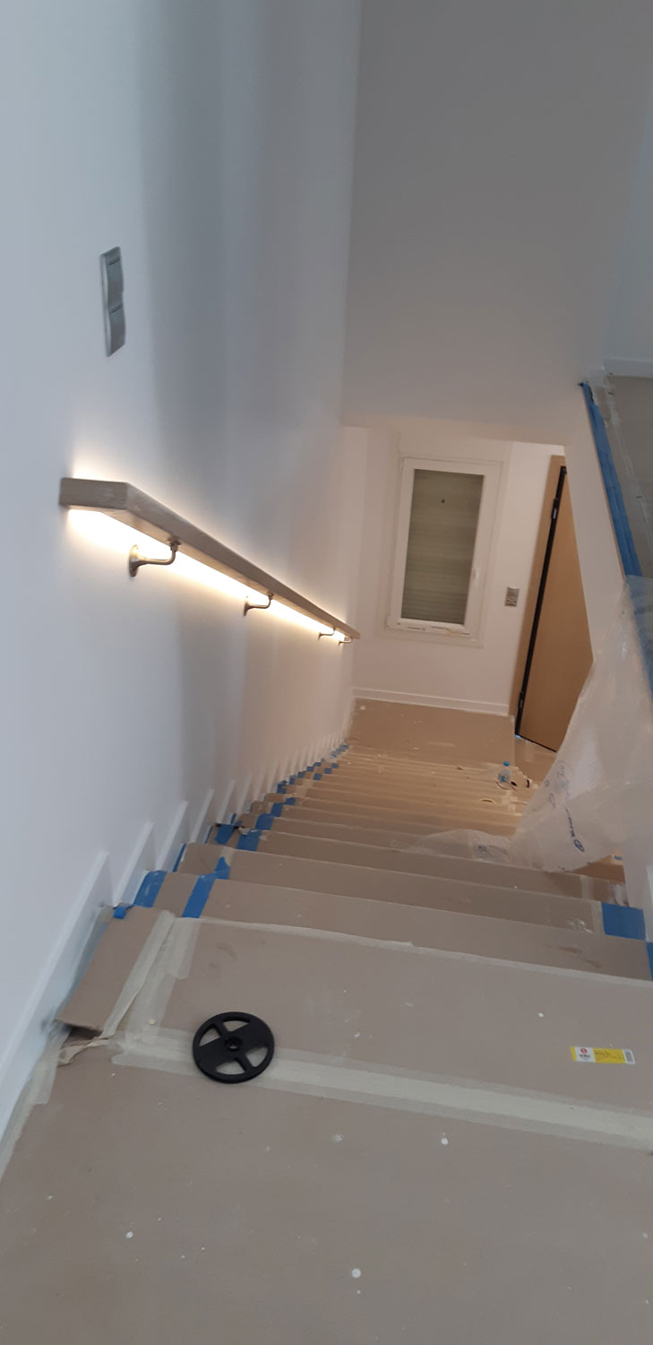 Στην κατοικία ενυπάρχει έντονο το στοιχείο του φυσικού ξύλου, ένα υλικό που αγαπούν πολύ ο Στέλιος κι η Αγγελική (ιδιοκτήτες). Επιλέχθηκε η χρήση του “iroko” εξωτερικά, καθώς έχει μια απόχρωση που εναρμονίζεται με τον περιβάλλοντα χώρο της κατοικίας. Εσωτερικά έχει επιλεγεί η παλαιωμένη δρυς για τα δάπεδα και τη σκάλα.